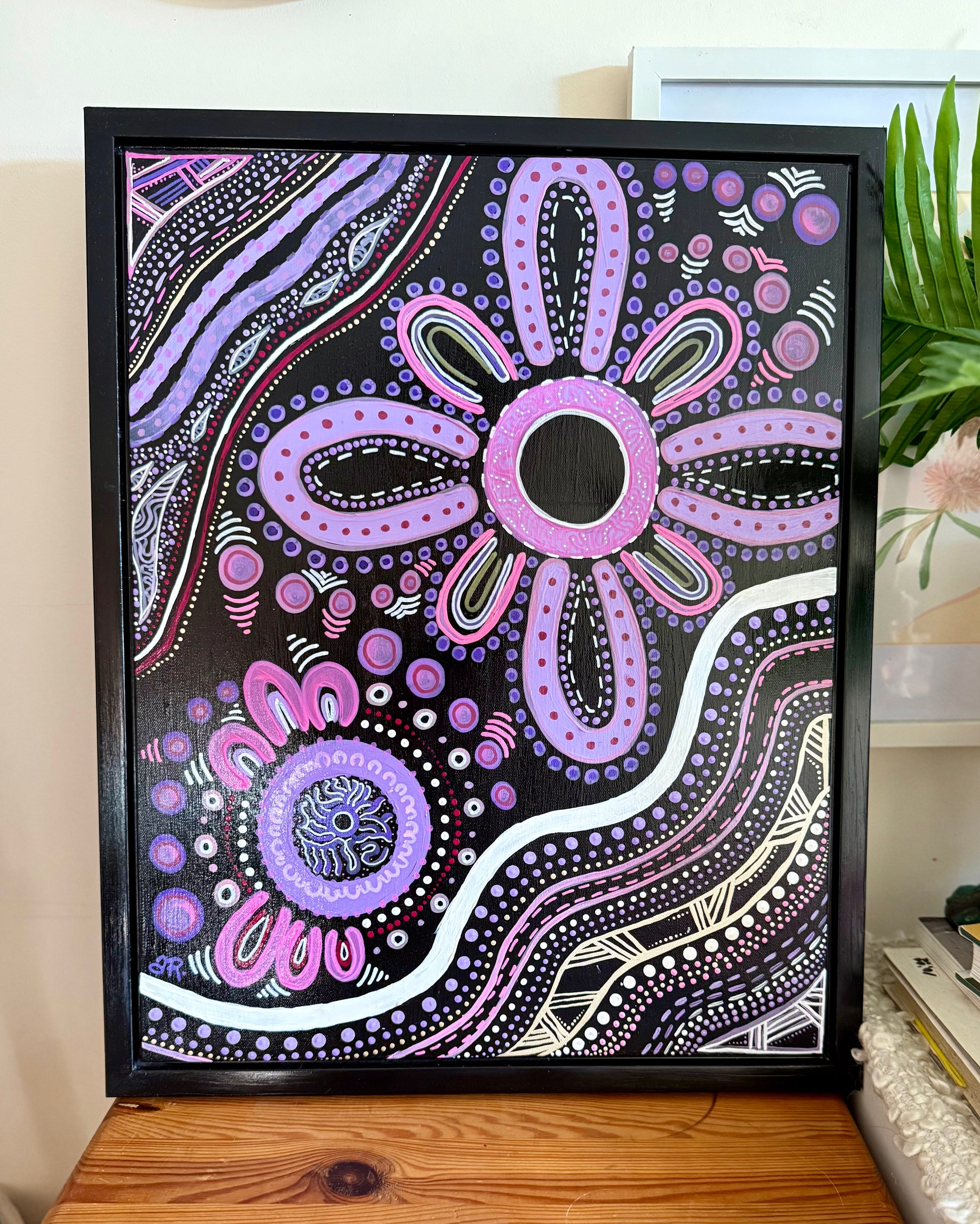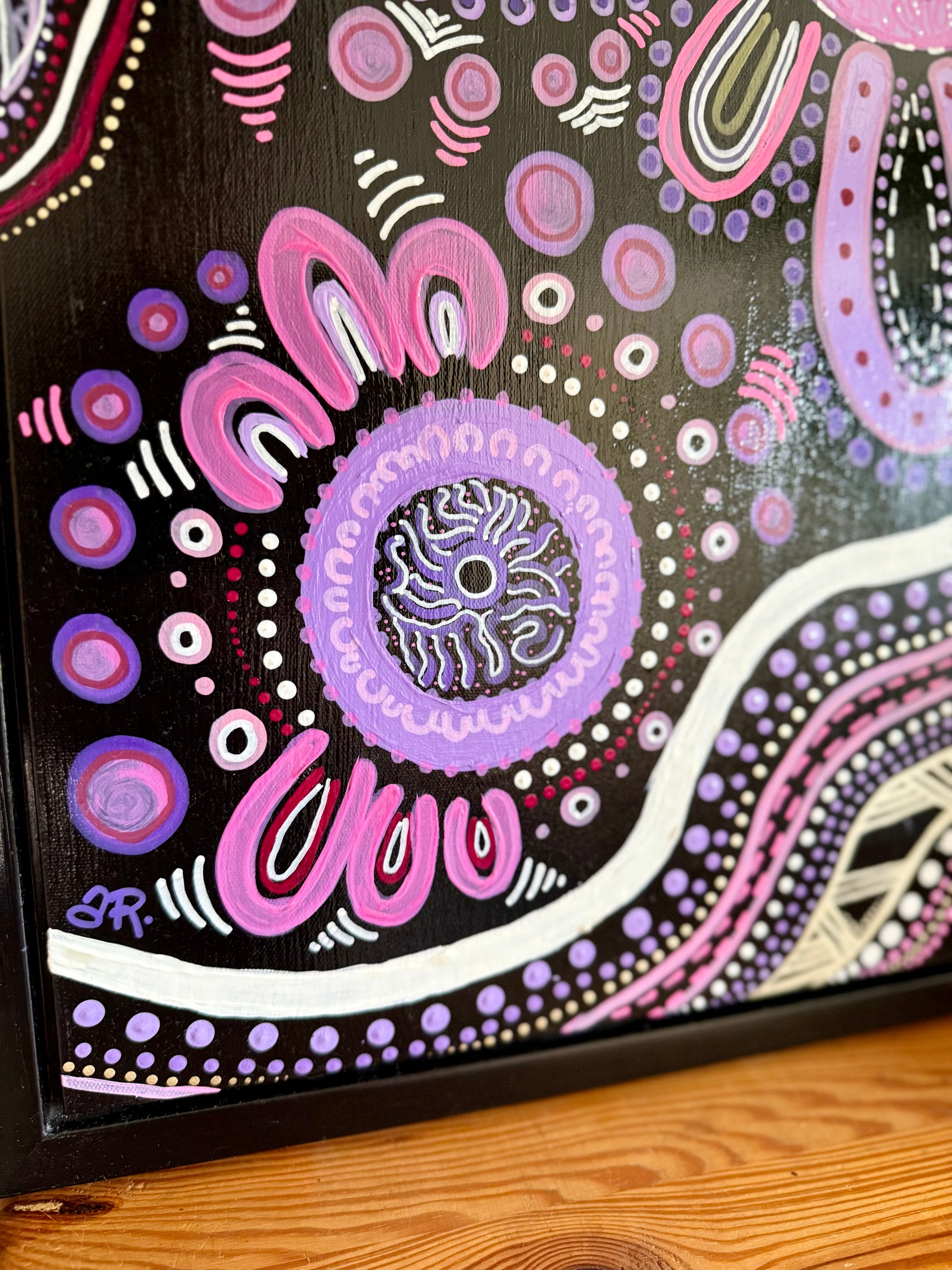 This piece was created in honour of a beloved purple mum now resting in the Dreamtime, whose love for the colour lives on, blooming in every connection she’s left behind.