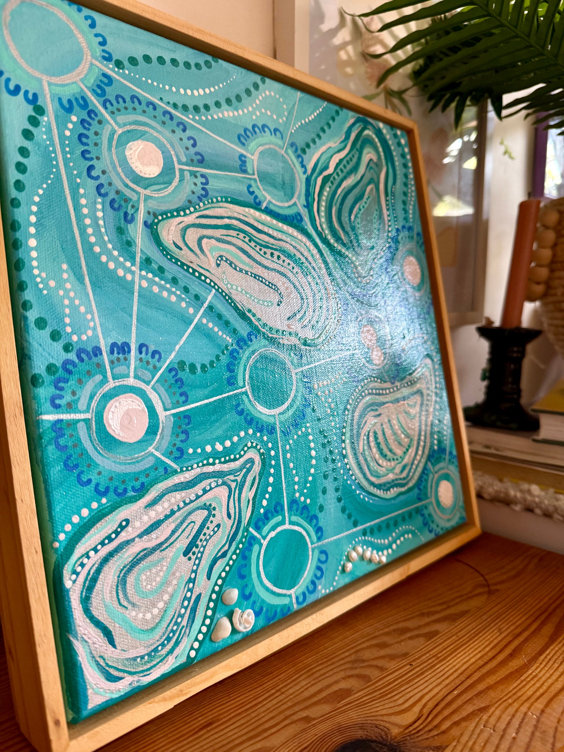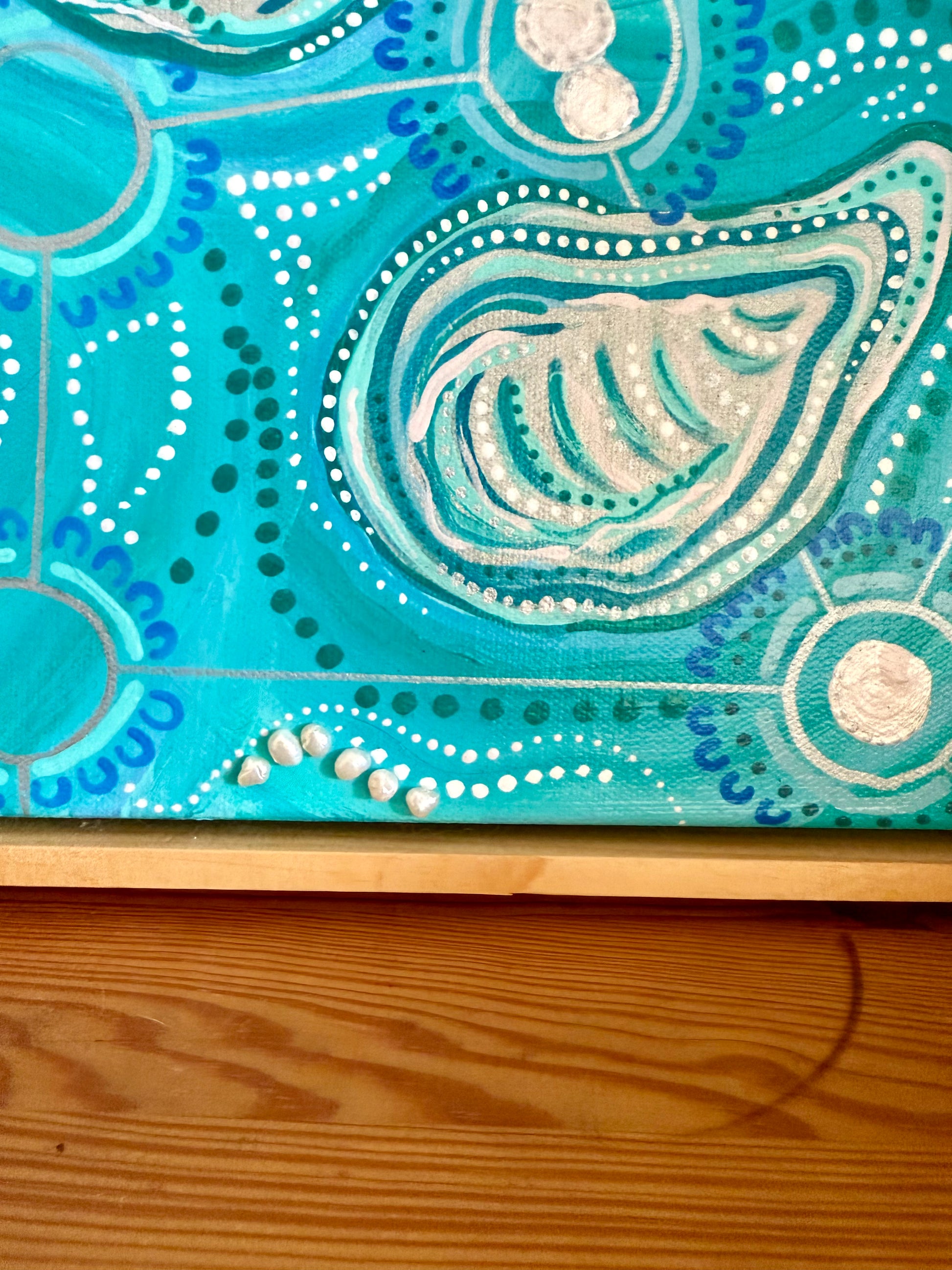 30x30cm oiled timber float frame, with acrylic, pearls and shells on canvas.