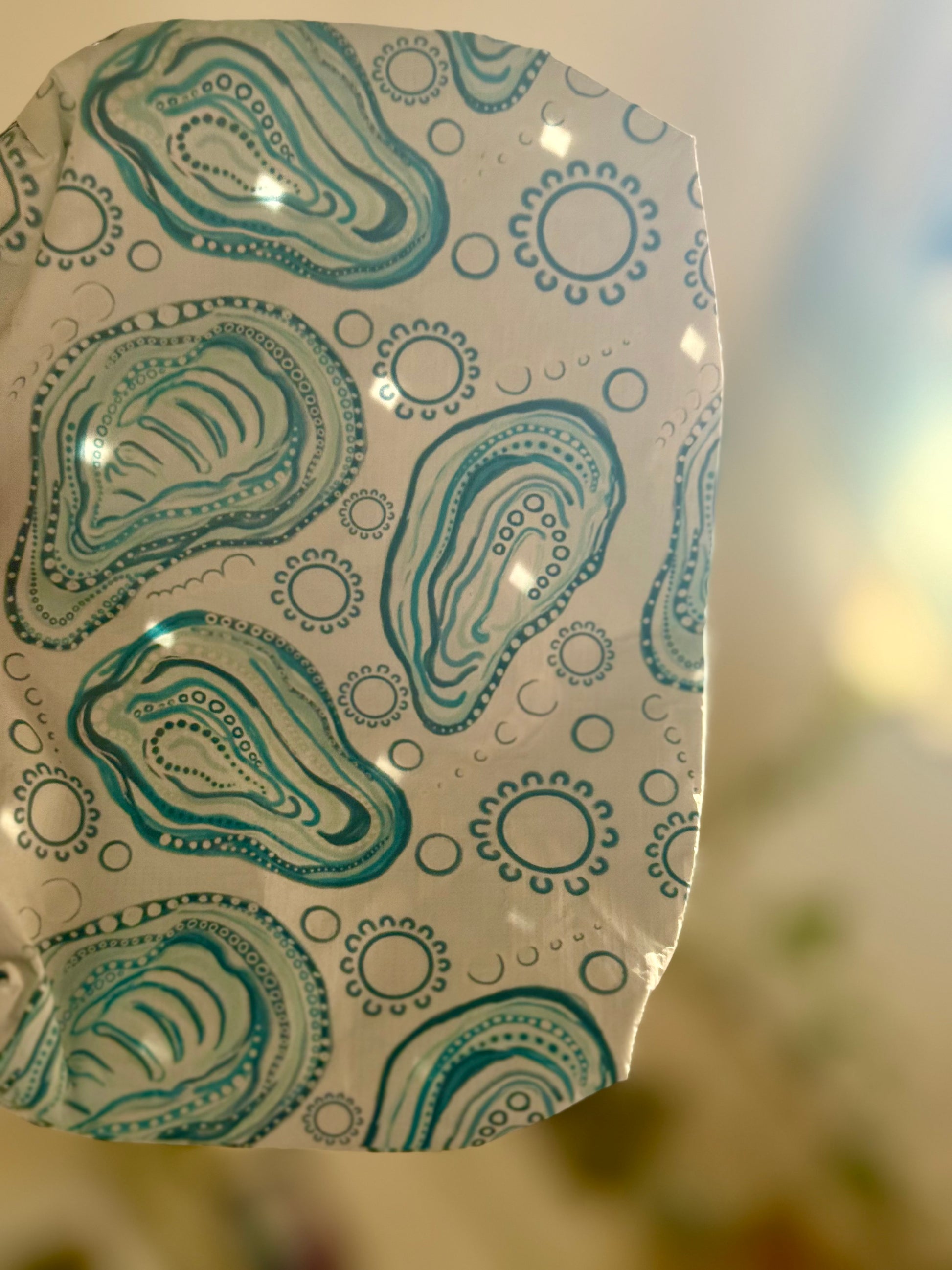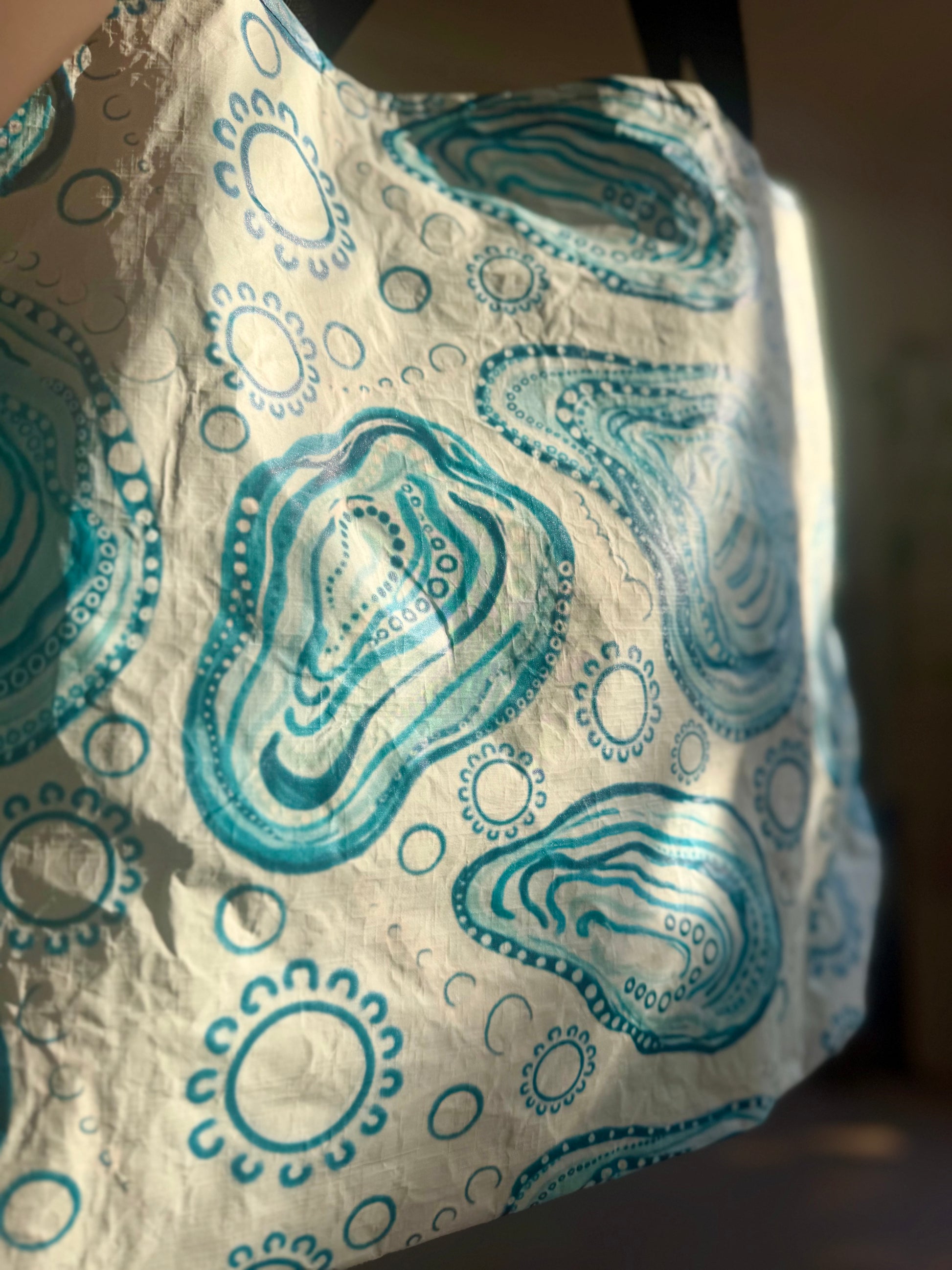 This piece is inspired by an original artwork that will always hold a special place in my heart. A close friend once told me it captured my joy — and I think she was right. The soft ocean hues and textured oysters speak to my deep connection to saltwater Country, where stories are held in every shell and tide.